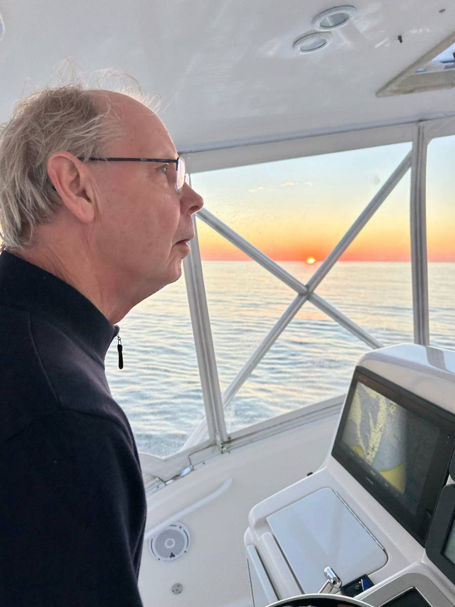 The Cheeky’s Captain focused at the helm. Tybee Inlet is notoriously long and takes forever to clear before heading south.