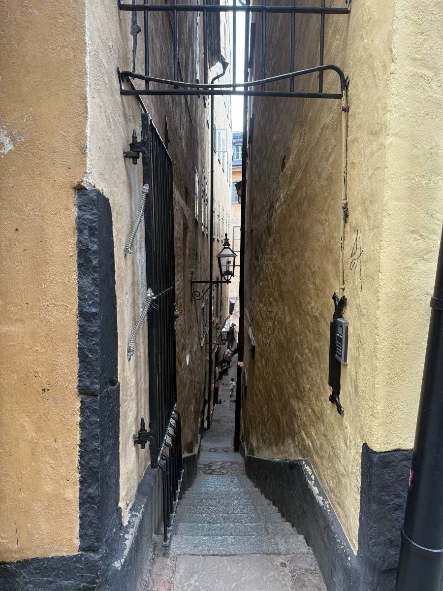 This is the narrowest alley in Gamla Stan, Marten Trotzigs Grand. It is barely wide enough for a normal sized man to walk through without turning sideways.